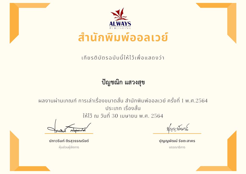 - เกียรติบัตร การเล่าเรื่องสั้น สำนักพิมพ์ออลเวย์ ครั้งที่ 1 พ.ศ. 2564