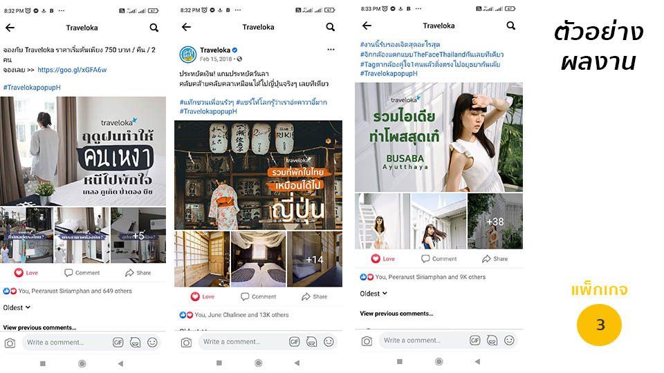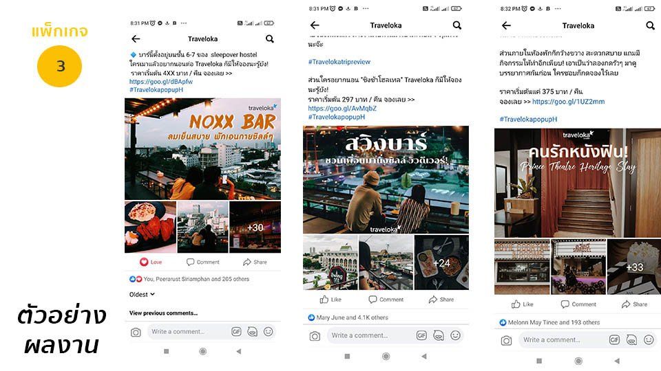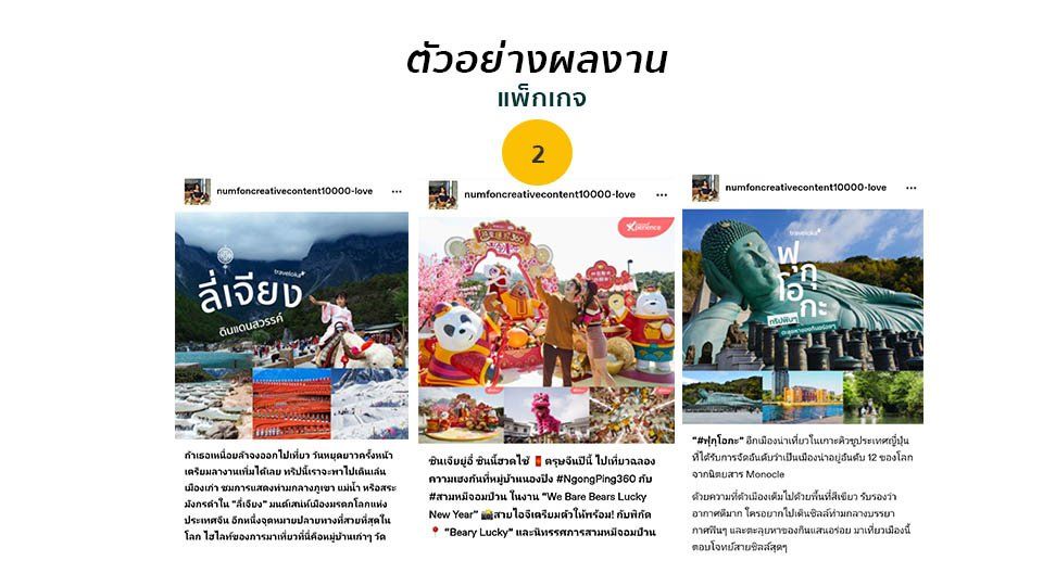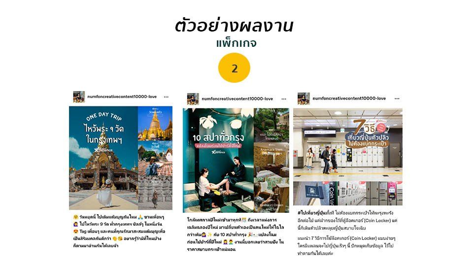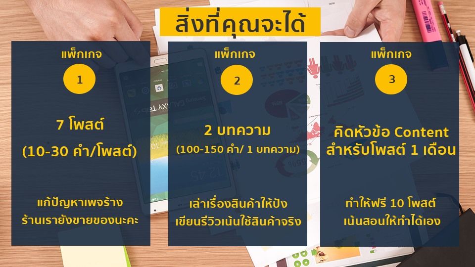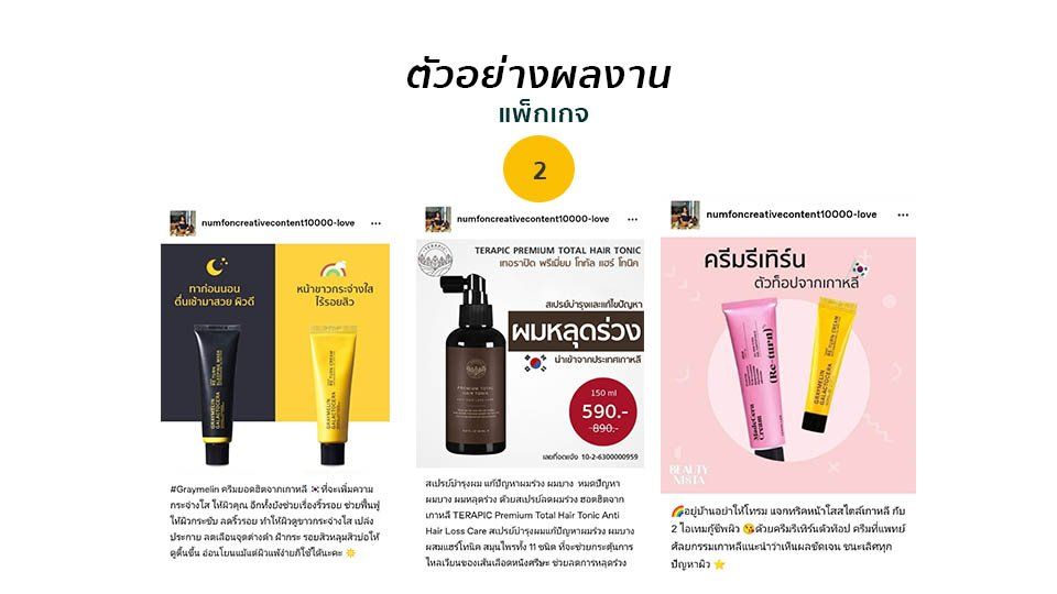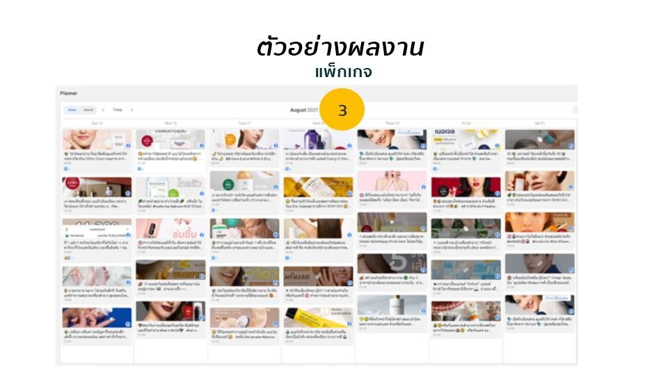 | จำนวนชิ้นงานที่ได้รับ | 7 โพสต์ (10-30 คำ/โพสต์ แก้ไขปัญหาเพจร้าง | 2 บทความ (100-150 คำ / บทความ) | แพลนหัวข้อ Content (30 โพสต์) สำหรับโพสต์ 1 เดือน |