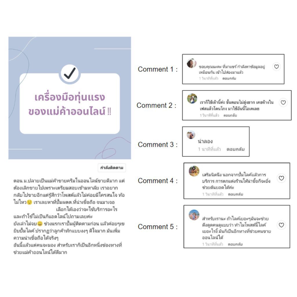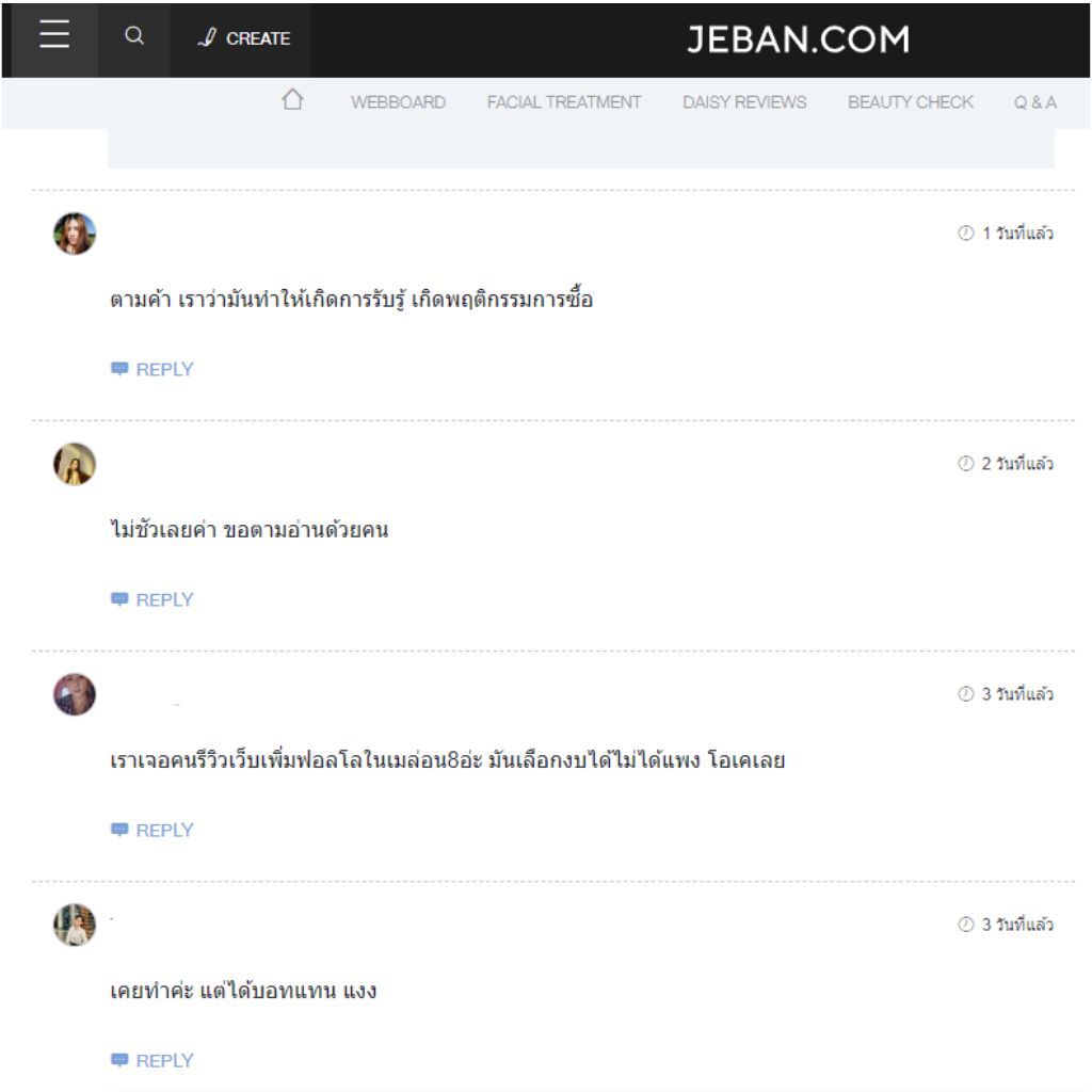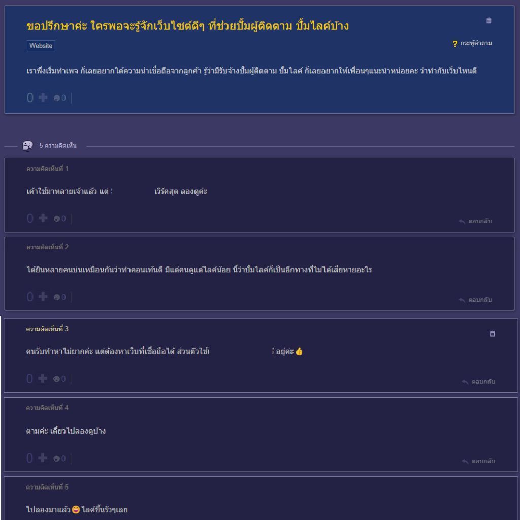 | แพ็กเกจ | 1,590 บาท ตั้งกระทู้คำถาม พร้อมหน้าม้าคอมเม้น /เรทนี้รวมเขียนบท เขียนคำถาม 1 + คอมเม้นดันสินค้า 5 | 2,900 บาท Seeding เชียร์สินค้าตามกระทู้ต่างๆ /เรทนี้รวมเขียนบท เขียนบท ไปคอมเม้นลงแพลตฟอร์มต่างๆ (30 คน) | ราคาตามตกลง กำหนดเอง คุณสามารถคุยกับฟรีแลนซ์เพื่อตกลงกันแบบอิสระได้ |