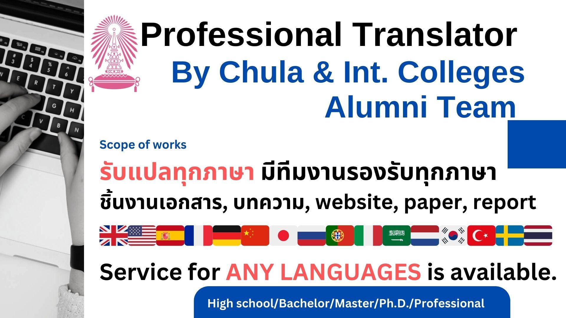 งานด่วน! รับแปลโดยอักษรศาสตร์ จุฬา อังกฤษ,สเปน,ฝรั่งเศส