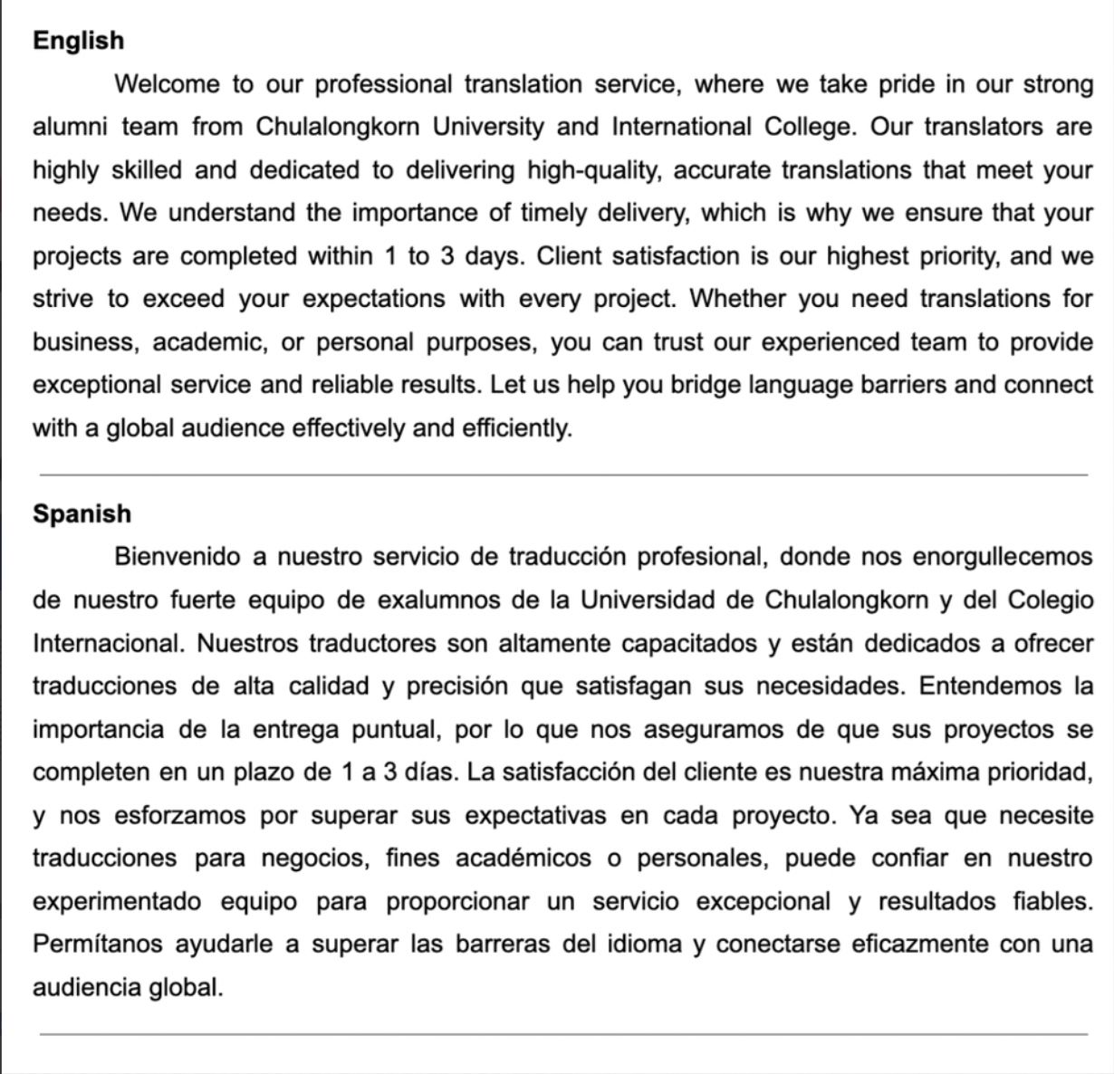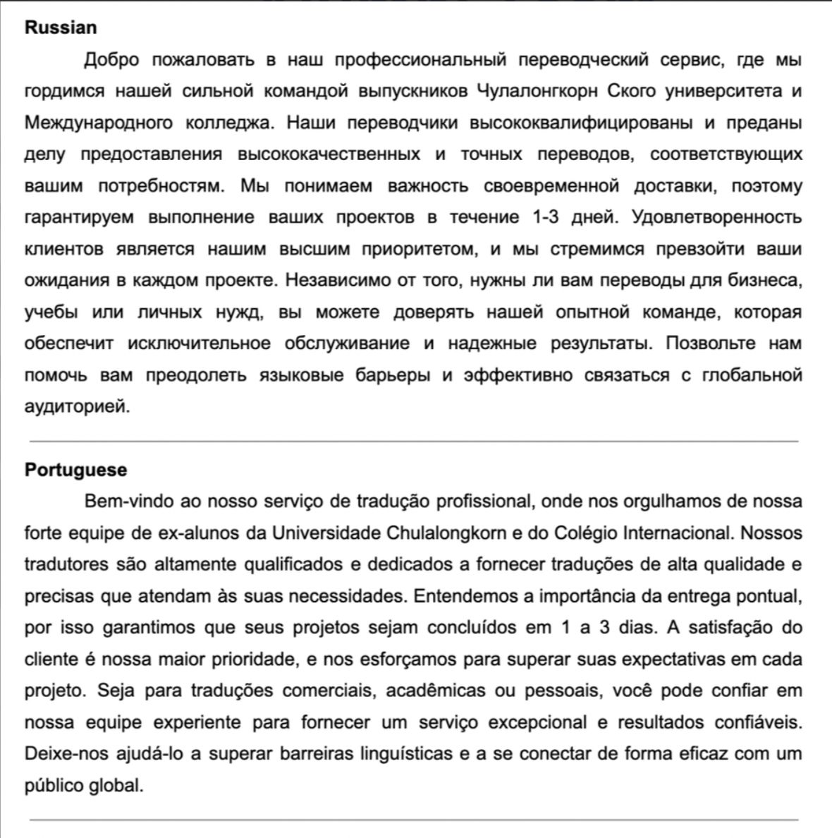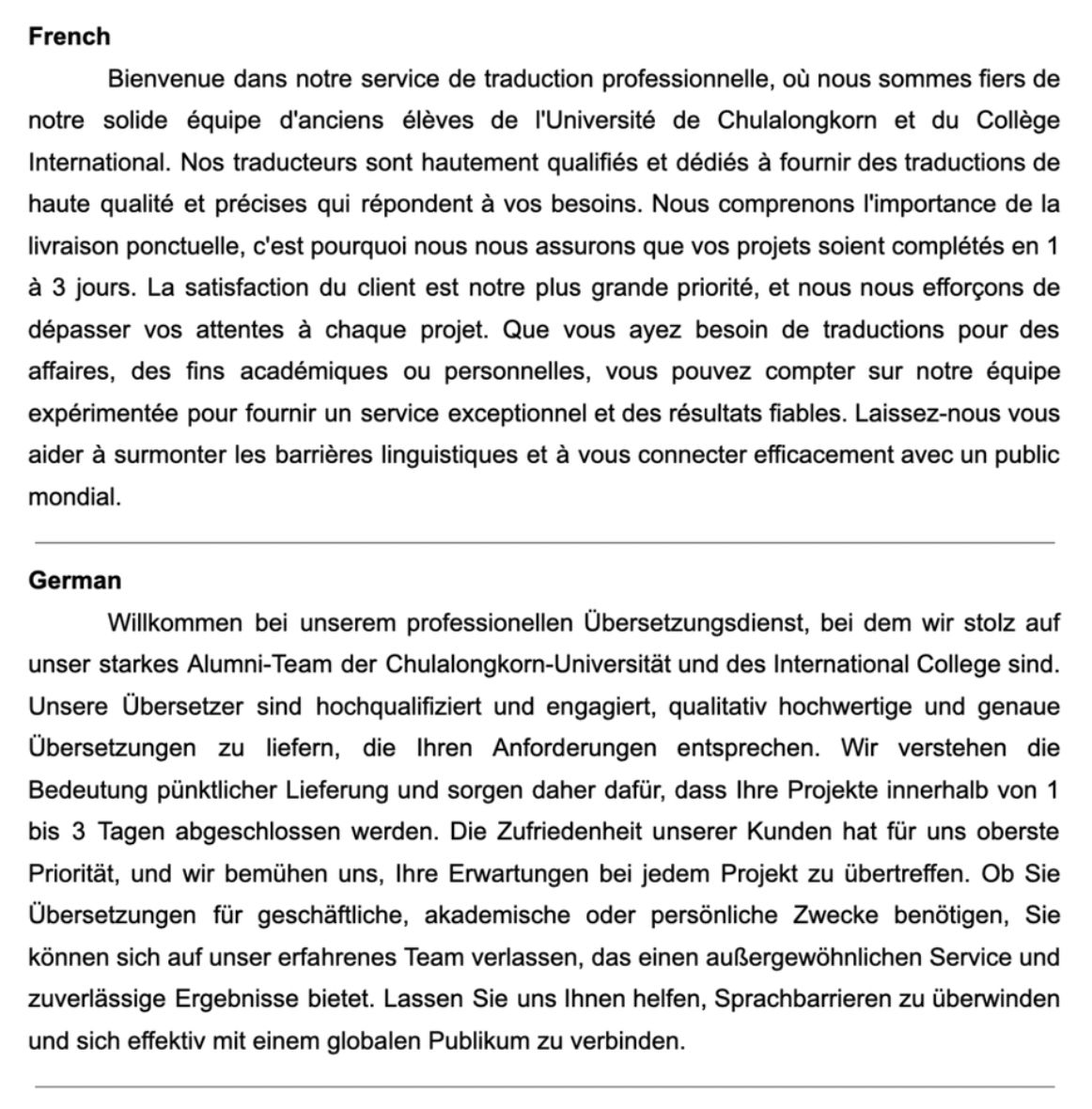 ผมและทีมงานจากคณะอักษรศาสตร์ จุฬาลงกรณ์มหาวิทยาลัย และศิษย์เก่ามหาวิทยาลัยต่างประเทศที่มีความเชี่ยวชาญในหลากหลายภาษา มีความชำนาญในการแปลบทความทุกรูปแบบ นอกจากนี้ เรายังทำงานร่วมกับทีมงานจากหลากหลายสาขาวิชา เช่น ธุรกิจ เศรษฐศาสตร์ วิทยาศาสตร์ วิศวกรรมศาสตร์ นิติศาสตร์ และศิลปะ ทั้งในระดับปริญญาตรี โท และเอก ที่มีความเชี่ยวชาญในการเขียนบทความเฉพาะทาง เพื่อให้ได้ผลงานที่ดีที่สุดสำหรับคุณลูกค้า