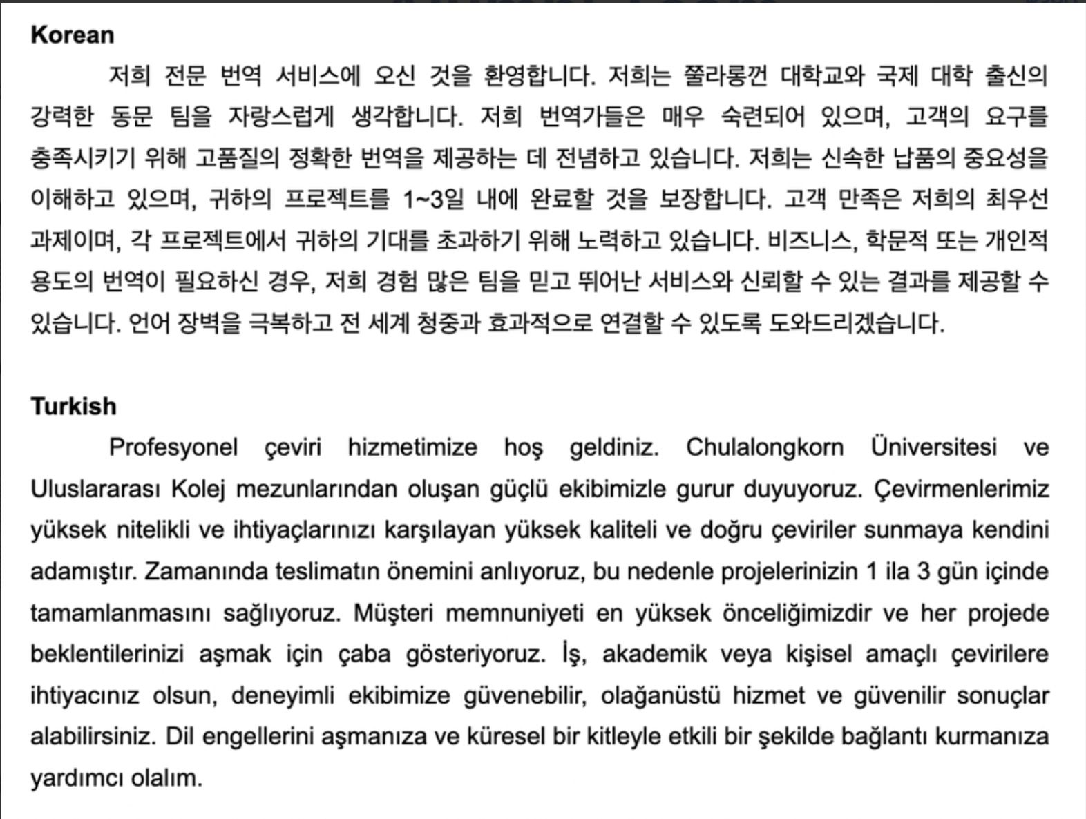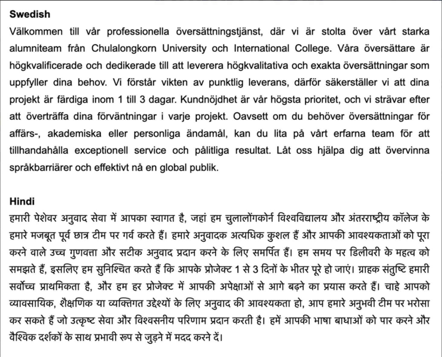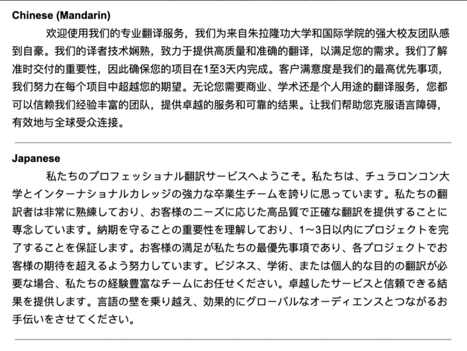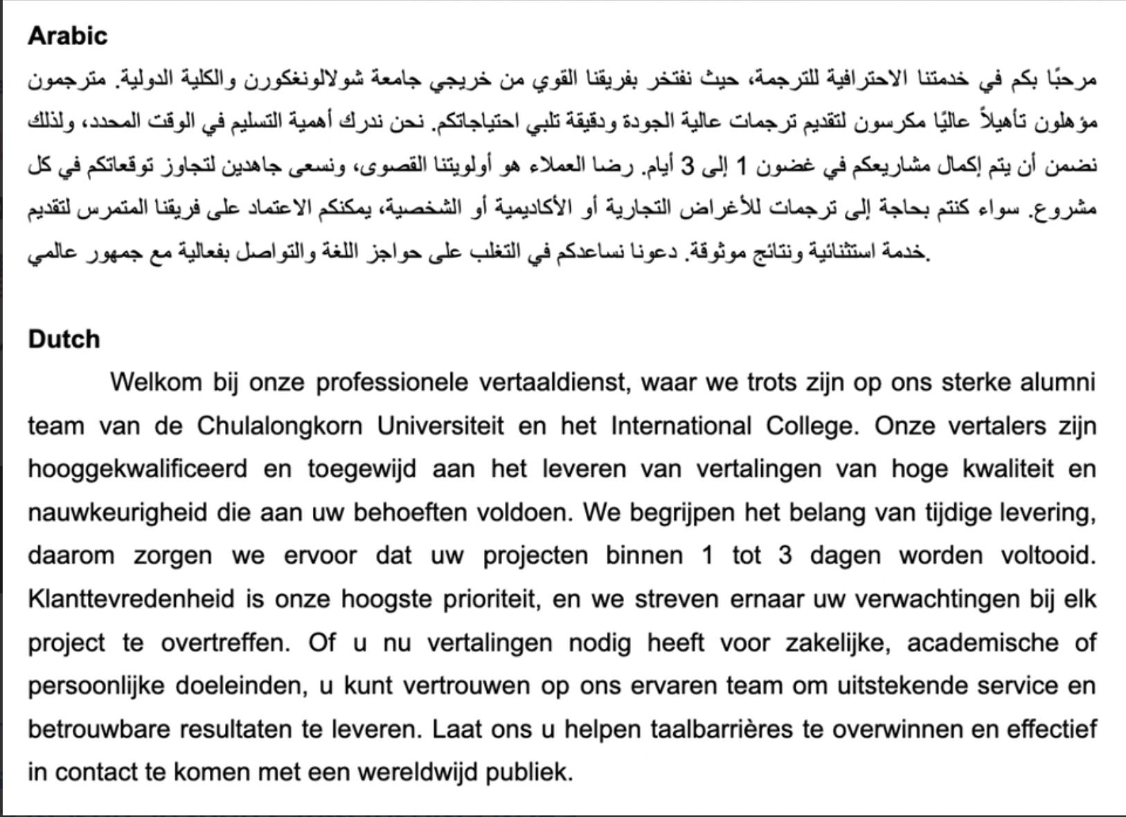 ผมและทีมงานจากคณะอักษรศาสตร์ จุฬาลงกรณ์มหาวิทยาลัย และศิษย์เก่ามหาวิทยาลัยต่างประเทศที่มีความเชี่ยวชาญในหลากหลายภาษา มีความชำนาญในการแปลบทความทุกรูปแบบ นอกจากนี้ เรายังทำงานร่วมกับทีมงานจากหลากหลายสาขาวิชา เช่น ธุรกิจ เศรษฐศาสตร์ วิทยาศาสตร์ วิศวกรรมศาสตร์ นิติศาสตร์ และศิลปะ ทั้งในระดับปริญญาตรี โท และเอก ที่มีความเชี่ยวชาญในการเขียนบทความเฉพาะทาง เพื่อให้ได้ผลงานที่ดีที่สุดสำหรับคุณลูกค้า