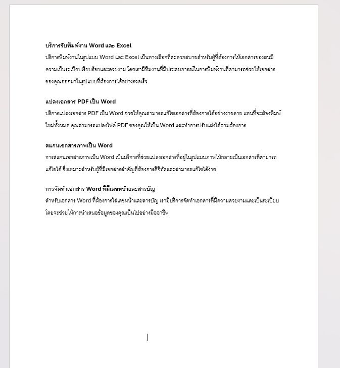 บริการพิมพ์งานในรูปแบบ Word และ Excel เป็นทางเลือกที่สะดวกสบายสำหรับผู้ที่ต้องการให้เอกสารของตนมีความเป็นระเบียบเรียบร้อยและสวยงาม โดยเรามีทีมงานที่มีประสบการณ์ในการพิมพ์งานที่สามารถช่วยให้เอกสารของคุณออกมาในรูปแบบที่ต้องการได้อย่างรวดเร็ว