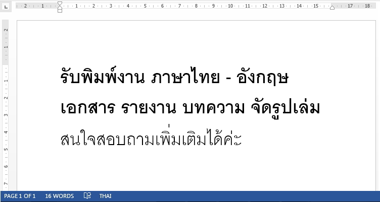 รับพิมพ์งานเอกสาร รายงาน บทความ และงานทั่วไป ทั้งภาษาไทยและภาษาอังกฤษ โปรแกรม Microsoft word - ระบุฟอนต์ ขนาด และสีของอักษรที่ต้องการ - กำหนดระยะขอบหน้ากระดาษ (ถ้ามี) - กำหนดลักษณะหมายเลขหน้า (ถ้ามี) - กำหนดระยะหัว/ท้ายกระดาษ (ถ้ามี) กรณีไม่กำหนดรายละเอียดของเอกสาร จะตั้งค่าเริ่มต้นไว้ดังนี้... - ฟอนต์ TH Saraban New ขนาด 16 - ระยะขอบหน้ากระดาษ ซ้าย 3 ขวา,บน,ล่าง 2 (เซนติเมตร) - ระยะหัว/ท้ายกระดาษ 1.5 เซนติเมตร **การส่งงาน** - ส่งงานเป็นไฟล์ .doc, .docx และ .pdf (สามารถเลือกอย่างใดอย่างหนึ่ง หรือทั้งสองแบบได้) - ส่งผ่านทางอีเมล์หรือช่องทางอื่นตามที่สะดวกได้ค่ะ (เช่น Mega, Gdrive, Mediafire)