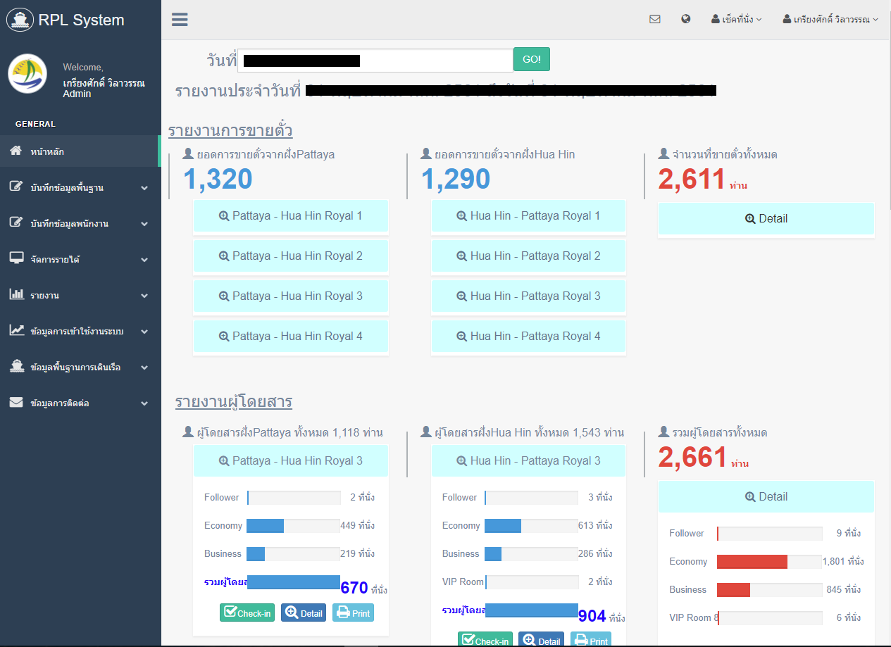 - รับจองตั๋วผ่านระบบจองตัว - ขายตั๋วให้ลูกค้า walk-in - แสดงผังที่นั่งเรือ และสถานะของที่นั่งว่าว่างหรือไม่ - สามารถปริ้นตั๋วผ่านระบบได้ - จัดการเที่ยวเดินเรือได้ - มี report โดยละเอียดและครอบคุม - มีระบบ check-in ของผู้โดยสารโดยการแสกนคิวอาโค๊ต
