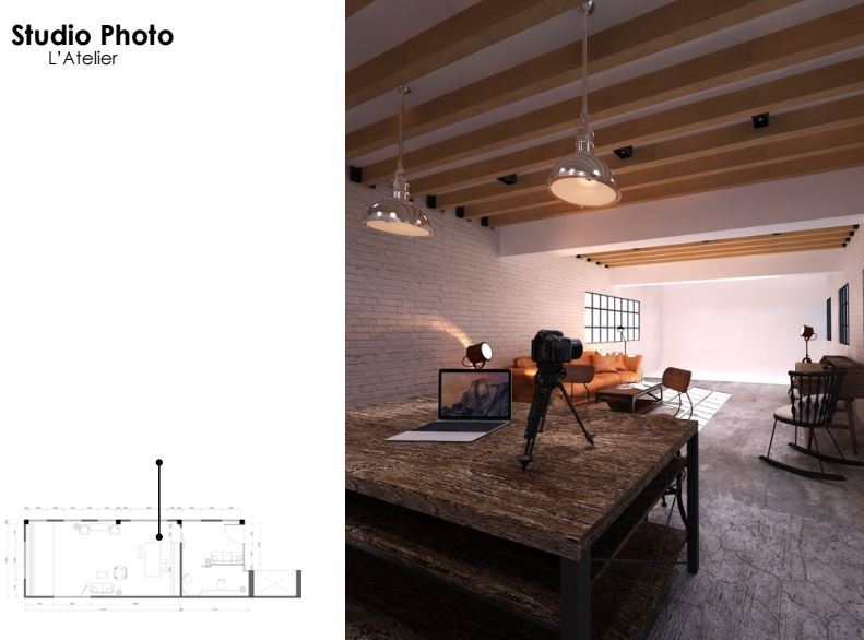 จาก concept ที่ดึงเอา element ของ Art studio ตาม warehouse และ ตึกร้าง ตามสไตล์ยุโรป ที่เรียกว่า Atelier มาดัดแปลงให้กลางเป็น studio สำหรับถ่ายภาพ ที่สามารถใช้ มุมทุกมุม ของ studio เป็นฉาก ด้วยตัวของมันเองได้ วัสดุที่มีความดิบ และเก่า อีกทั้งประกอบไปด้วย texture ทำให้มีความรู้สึก มีเรื่องราวในตัวของมัน